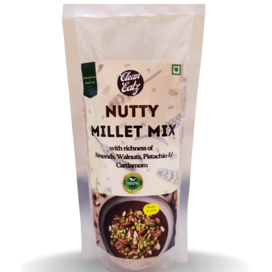 Indulge in the wholesome goodness of CleanEatz’s Nutty Millet Mix, a premium blend designed to elevate your nutritional intake. Our Nutty Millet Mix is meticulously crafted from a diverse combination of millet grains, enriched with the richness of almonds, walnuts, pistachios, and a hint of aromatic cardamom. This exceptional mix offers a powerhouse of fiber, protein, and vital nutrients, ensuring a perfect balance of taste and health in every bite.